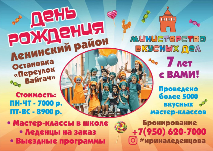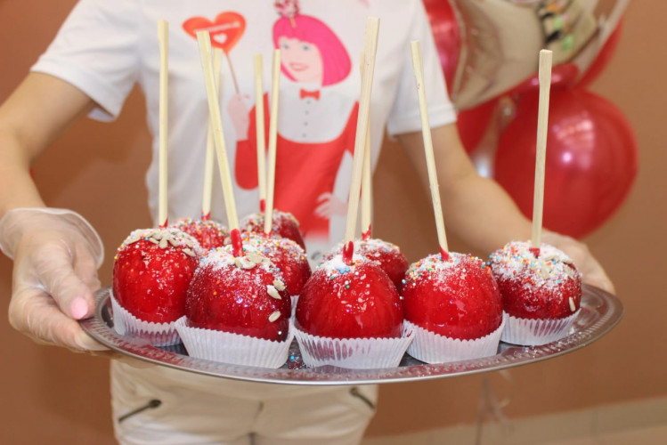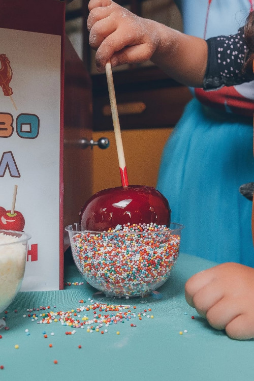 1ч 20 мин выделяется на карамельный мастер-класс, в рамках которого именинник и каждый гость научатся крутить карамельку и изготовят леденцы и карамельное яблочко, которые заберут с собой.