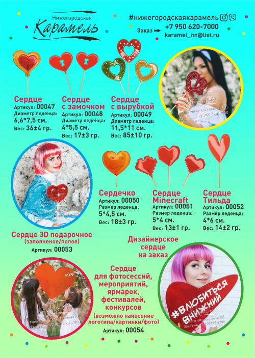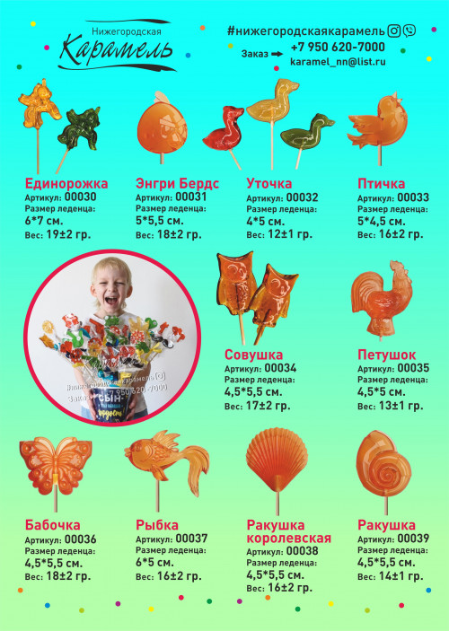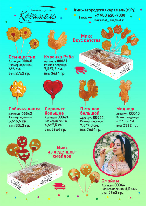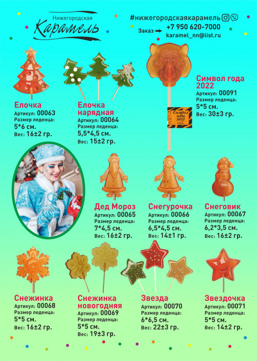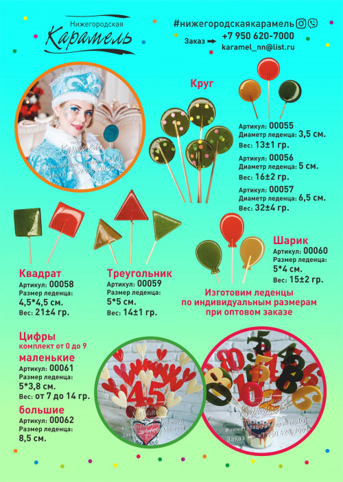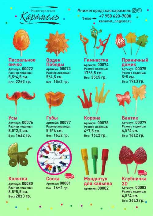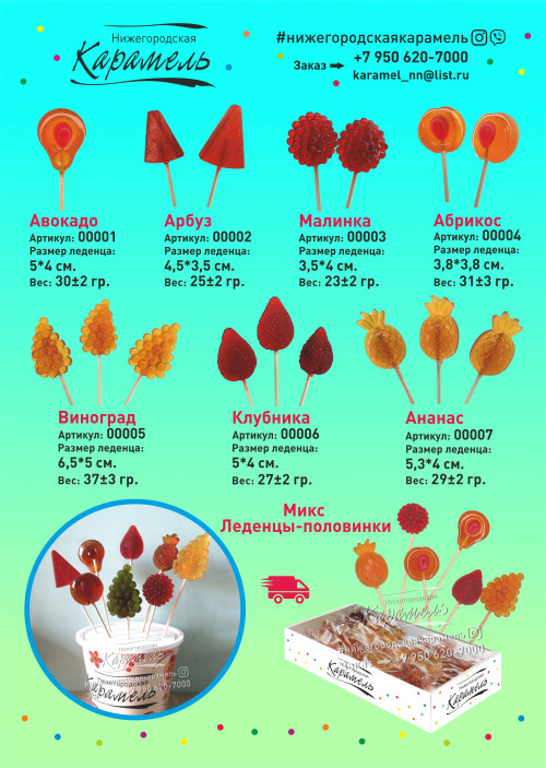 У нас огромный выбор леденцов, некоторые варианты указаны в каталоге со всеми параметрами(вес, размер).